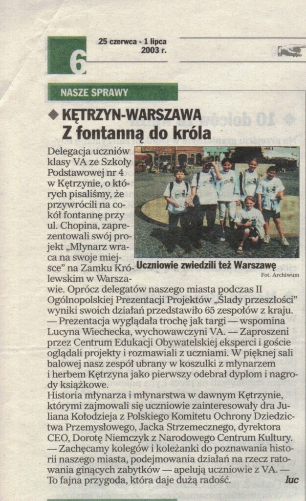 Dzięki projektowi „Młynarz wraca na swoje miejsce”, który zrealizowaliśmy wraz z koleżankami i kolegami z klasy przy wsparciu naszej wychowawczyni Lucyny Wiecheckiej, udało się przywrócić pomnik na jego pierwotne miejsce. W czerwcu 2003 roku młynarz ponownie stanął na cokole, odzyskując swoją dawną rolę w miejskim krajobrazie.